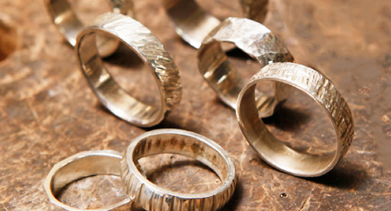 一般的に販売されている指輪は、量産をする作り方なので低価格ではありますが、味わいや風合いがうまれません。模様の輝きも均等でやわらかな輝きにはなりません。銀は塑性加工をする事で程よい強度が増してしなやかさが生まれます。また、手打ちで打った模様が乱反射をして優しい光線となり、磨くことで更に輝きが増して銀ならではの使用感を贅沢に楽しむことができる一押しのアイテムとなっています。