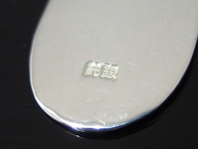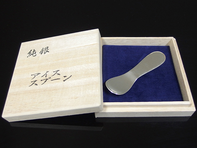 現代の名工 上川宗照の刻印が入り、表面には鎚目模様が入った純銀の手打ちアイススプーンです。
